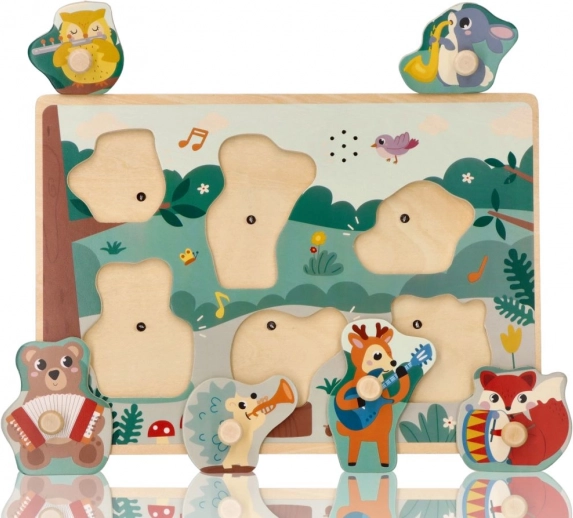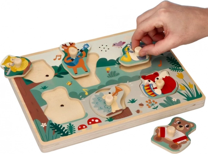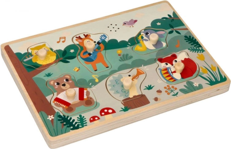 Ta lesena zvočna vstavljanka z gozdnim motivom otrokom na igriv način predstavlja glasbila. Vsak barviti košček z živaljo ima praktičen ročaj za lažji oprijem, po vstavitvi na pravo mesto pa se oglasi ustrezen zvok, ki spodbuja k ponovnemu igranju in raziskovanju.