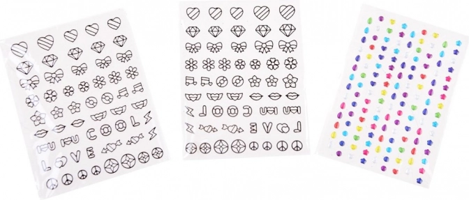 - 7× flomaster/lak s tanko konico in čopičem, 4× bleščice, nalepke (konture in barvne pikice), dekorativni kamenčki/nalepke, 2× separator prstov, pilica v obliki srca, mini sušilnik za nohte