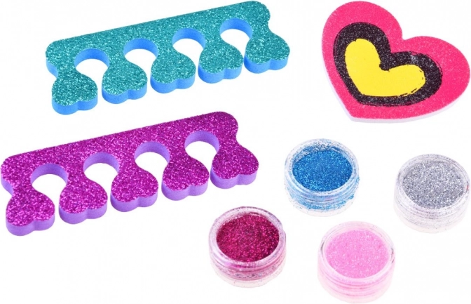 Štiri barve bleščic in nalepke za efektno okraševanje dopolnjujejo mehki separatorji prstov – lakiranje nohtov na nogah bo udobno in natančno.