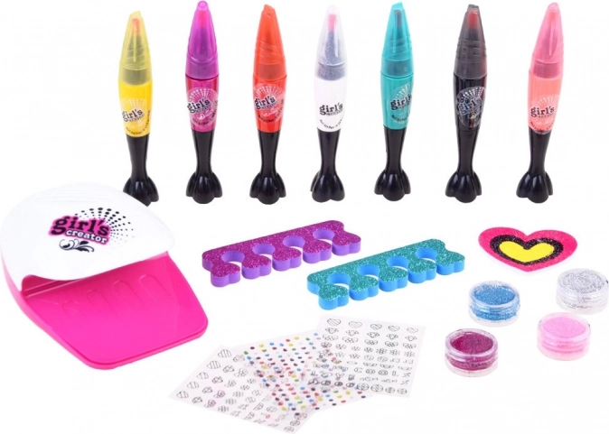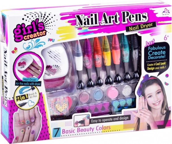 Kreativni set za manikiro in pedikuro za otroke prinaša vse, kar potrebujete za izvirno okraševanje nohtov: 7 barvnih flomastrov/lakov z natančno konico in čopičem, bleščice, nalepke, separatorje prstov ter praktičen mini sušilnik na baterije. Odlična zabava za domači SPA in druženja s prijateljicami.