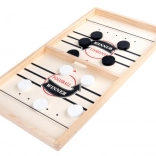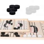 Zabavna družinska namizna igra iz trpežnega lesa za dva igralca. Cilj je prestreli vse ploščke na nasprotnikovo stran skozi sredinsko odprtino. Hitra, napeta in varna igra, ki vadi reflekse in natančnost, ima kompaktne dimenzije in je primerna za otroke od 3 let.