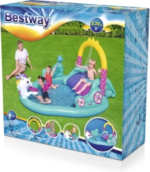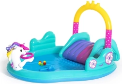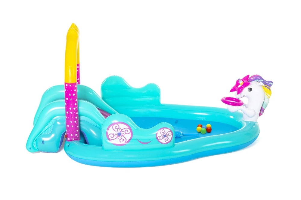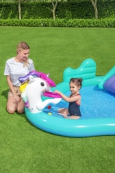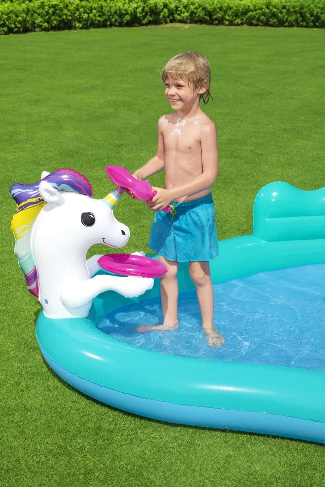 To pisano napihljivo igrišče s samorogom spremeni vroče dni v nepozabno vodno dogodivščino. Dovolj je, da na lok priključite vrtno cev, in nastane nežna vodna prha, ki otroke prijetno osveži. Prostran bazenček s prostornino 220 litrov je idealen za male ljubitelje vode, zahvaljujoč čvrsti PVC konstrukciji pa zlahka prenese navdušeno otroško igro.