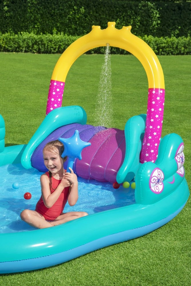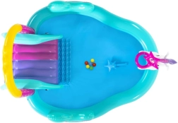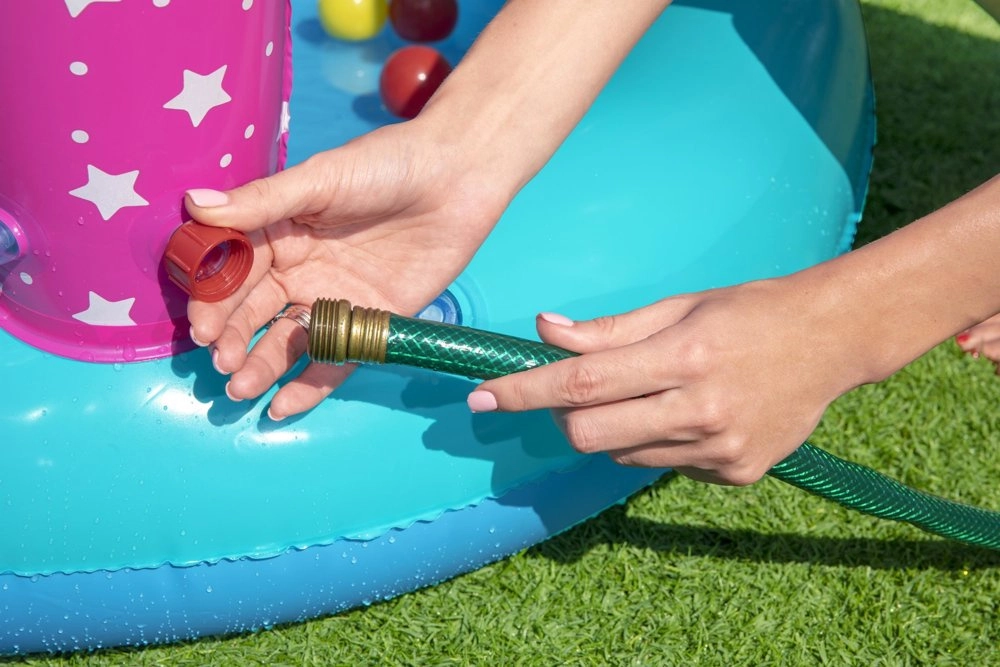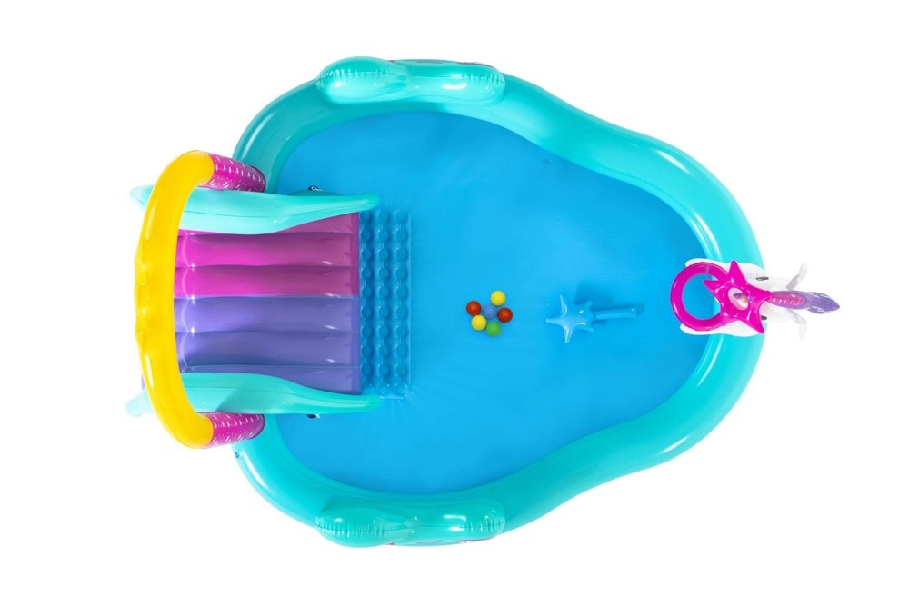V paketu so tudi zabavni dodatki – 6 žogic, metni obroč v obliki zvezde in čarobna paličica, s katerimi si otroci ustvarijo svoje igralne scenarije. Praktičen izpustni ventil olajša vzdrževanje in pospravljanje po kopanju.