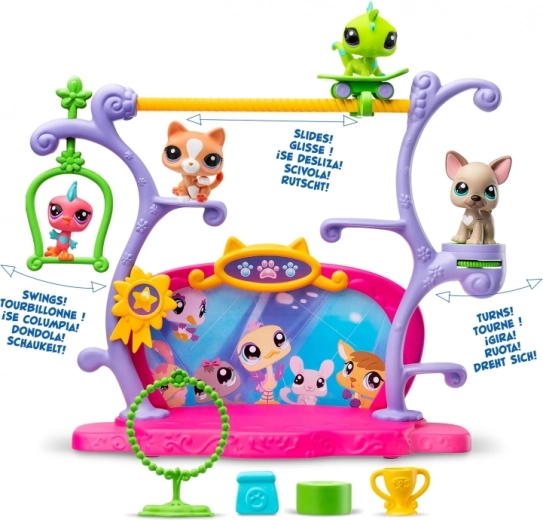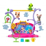 Dobrodošli, vsi oboževalci priljubljenih živalic Littlest Pet Shop! Prichaja Generacija 7 z več kot 65 novimi prijatelji v kolekciji. Ta igralni set vključuje francoskega buldoga in ptička, ki sta pripravljena na show talentov. Pridružite se virtualnemu svetu Littlest Pet Shop z uporabo posebne kode, ki odklene ekskluzivne figurice in presenečenja.