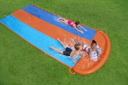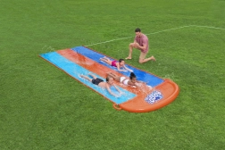 Začnite poletje na polno z vodnim toboganom BESTWAY dolžine 4,88 m in s tremi voznimi pasovi za otroške dirke. Vgrajene stranske prhe ohranjajo površino spolzko – le priključite vrtno cev in zabava se lahko začne. Trpežen PVC material, mehki končni del za pristanek in enostavna namestitev brez orodja zagotavljajo varne in neskončne vodne vragolije za otroke od 3 let dalje.