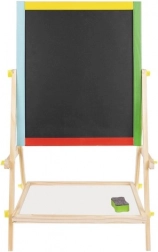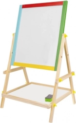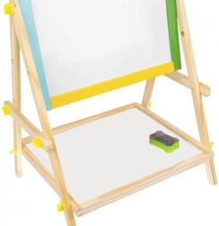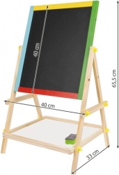 Stabilna lesena konstrukcija z barvnimi elementi je trpežna in varna za otroke. Praktična polica za pripomočke poskrbi, da so krede, flomaster in gobica vedno pri roki. Enostavna montaža brez specialnega orodja razveseli vsakega starša, kompaktne dimenzije pa se prilegajo otroški sobi ali igralnici.