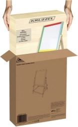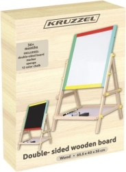 Dvostranska otroška tabla KRUZZEL združuje kreativno zabavo in učenje. Ena stran ponuja kredno površino za risanje s kredami, druga pa belo suho brisljivo površino z magnetno funkcijo za pisanje s flomastrom in delo z magneti. Vrtljiv sistem omogoča hitro menjavo površine s pomočjo metuljastih vijakov.