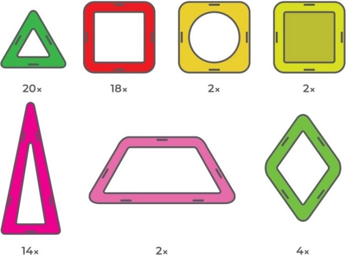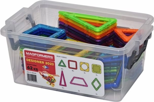 Magformers Designer 2023 prihaja z raznoliko paleto geometrijskih oblik, vključno s trikotniki, kvadrati in rombi. Ta set podpira modeliranje ne le živali in predmetov za vsakdanjo rabo, ampak tudi abstraktnih objektov, kar naredi vsak zgrajen model edinstven. Vsebina pakiranja: