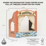 Zamislite si, da se vaši otroci izgubljajo v svetu domišljije in zgodb. To lutkovno gledališče je narejeno iz kakovostnega lesa s certifikatom FSC in ima tkaninske zavese, ki dodajo predstavi pristnost. Okrašeno z zlatimi detajli in vsebuje tudi okence za predprodajo vstopnic in tablo za napoved predstave. V notranjosti se lahko odpre čudovita nočna scena z zvezdami, ki ustvari čarobno vzdušje.