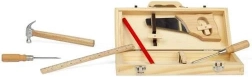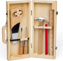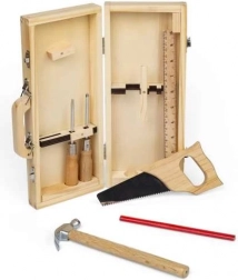Žaga, kladivce, izvijači, tesarsvinčnik in ravnilo – vse prilagojeno otroškim rokam za prve varne izkušnje z ustvarjanjem.