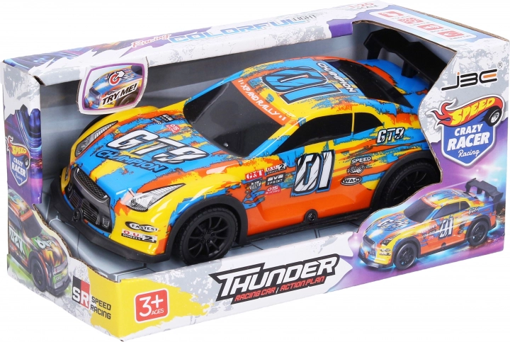 Stilski dirkalni avto je idealen za male in večje dirkače. Zahvaljujoč vztrajniku je dovolj, da avto potisnete, spustite in opazujete, kako švigne naprej. Ob pritisku na sprednji pokrov se aktivirajo svetlobni in zvočni učinki, ki še okrepijo doživetje igre.