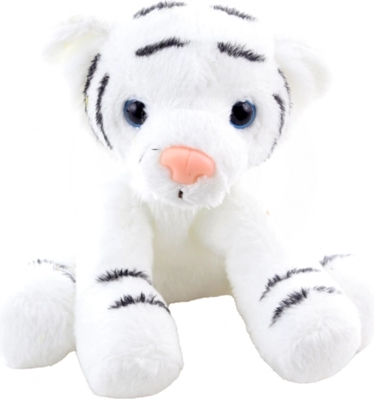 Prisrčen plišasti tiger v belem videzu s črnimi črtami in modrimi očmi, idealen za otroško igro in udobje.