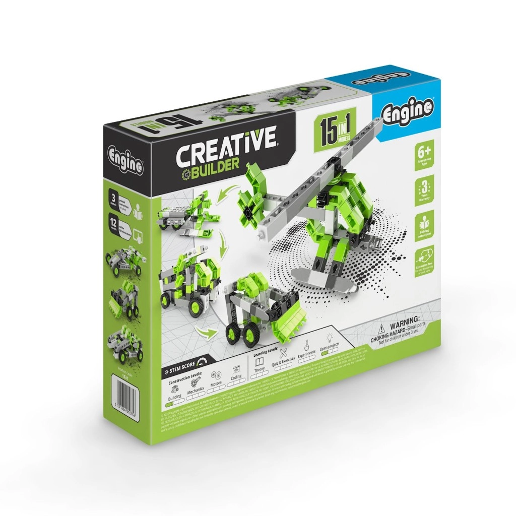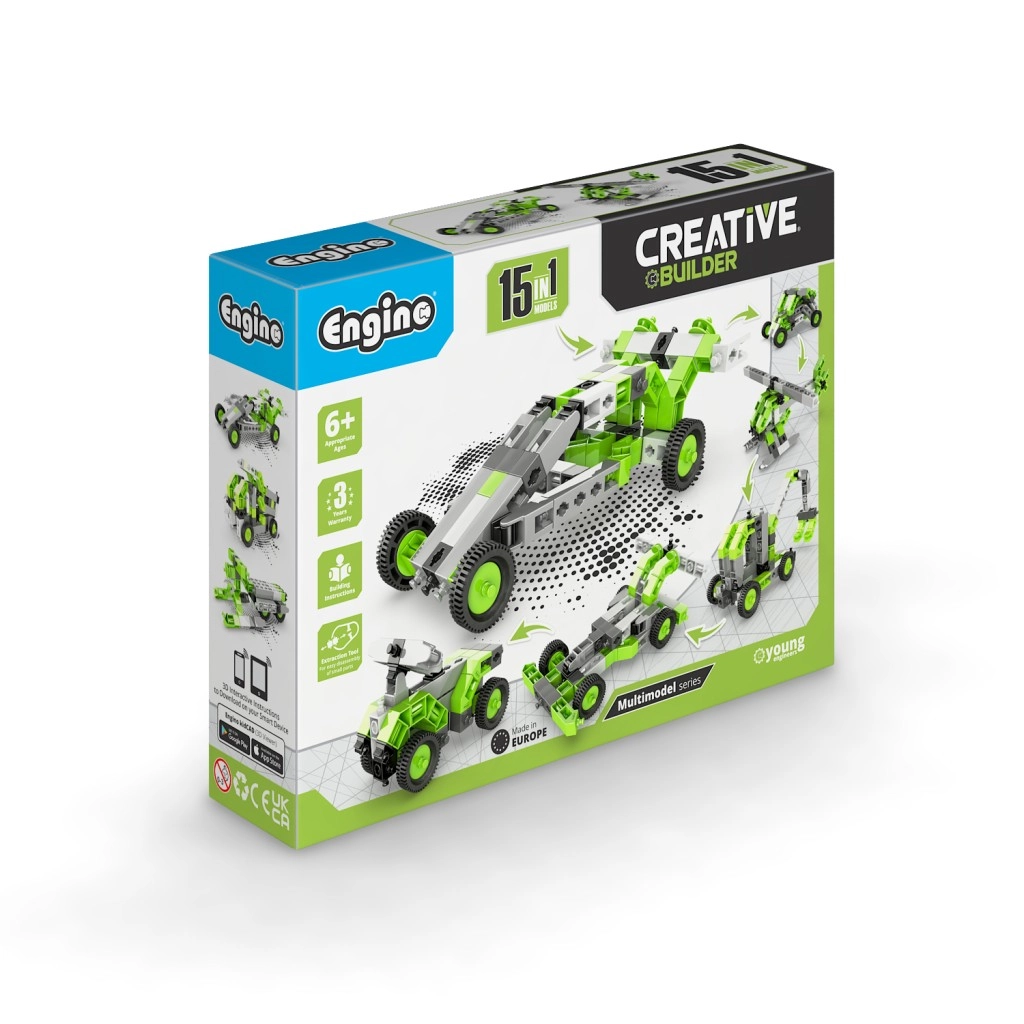 Gradbeni set Engino Creative Builder 15 v 1 otrokom prinaša ure zabave in učenja. Zahvaljujoč pametnemu sistemu povezav otroci zlahka preoblikujejo en izdelek v drugega in preizkušajo različna mehanska načela. Intuitivna mobilna aplikacija Engino kidCAD v slovenščini prikazuje modele v 3D, zato jih je mogoče vrteti, približevati in sestavljati korak za korakom.
