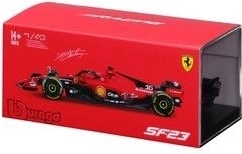 Natančen model F1 FERRARI SF23 v merilu 1:43 prinaša verne proporce in dirkaške detajle, vključno s sprednjim in zadnjim krilom, slick pnevmatikami ter halo zaščito kokpita. Avtentična rdeča poslikava FERRARI s sponzorskimi logotipi in startno številko Charlesa Leclerca poudarja zbirateljsko vrednost.