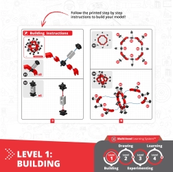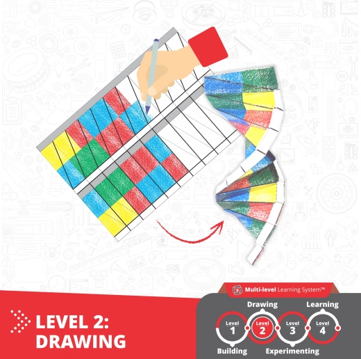 Štiristopenjski koncept razvija fino motoriko, prostorsko predstavljivost in zanimanje za naravoslovje. Otroci najprej zgradijo model, nato ga dodelajo z barvanjem papirnatih delov, preizkusijo preproste eksperimente in na koncu utrdijo znanje v igrivi obliki učenja.