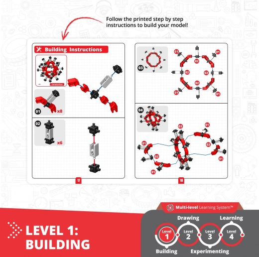 Gradbeni set Engino Kako delujejo virusi otrokom ponuja privlačen način razumevanja sveta mikroorganizmov. Omogoča sestavljanje 2 modelov in ponuja pameten izobraževalni sistem v več stopnjah – od praktične gradnje do igrivega učenja in poskusov. Z aplikacijo Engino kidCAD lahko sledite podrobnim 3D navodilom in zlahka obvladate tudi zahtevnejše korake.