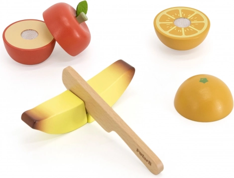 Leseno sadje na ježka z nožkom razvija fino motoriko, koordinacijo in socialne veščine pri igri kuharja ali trgovine.