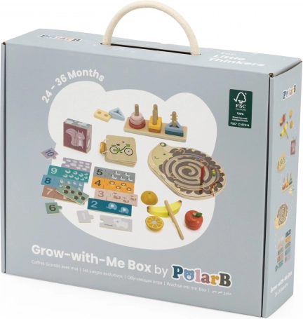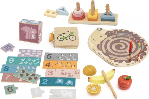 Del paketa so magnetni ježev labirint, sestavljanke in puzzle, set sadja za rezanje ter lesena knjižica s prevoznimi sredstvi. Vse je shranjeno v priročni škatli z ročajem za enostavno prenašanje. Idealna izbira za male raziskovalce, pripravljene na naprednejše naloge.