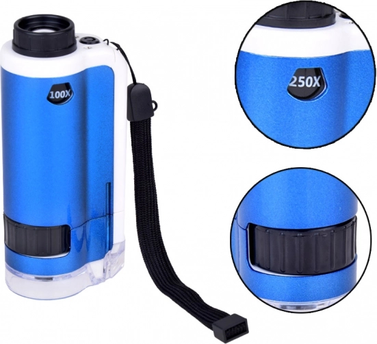 Odkrijte skriti svet s tem kompaktnim žepnim mikroskopom za otroke in odrasle. Ponuja približanje 100× in 250×, LED osvetlitev za jasno sliko ter vzdržljivo kovinsko-plastično zasnovo. Zahvaljujoč paščku in zaščitni vrečki je idealen za na pot, v šolo in na teren.