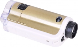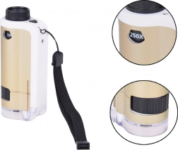 Naprava je preprosta za uporabo: prislonite prozorno osnovo na površino opazovanega predmeta, z vrtljivim koleščkom izostrite in po potrebi izberite povečavo 100x ali 250x. Trpežna kovinsko-plastična izdelava, napajanje 1× AAA 1,5 V in priložena dodatna oprema ga naredijo odlično učno darilo.
