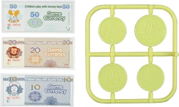 Set vključuje papirnate bankovce in plastične kovance, zasnovane za poučevanje otrok o finančni pismenosti.