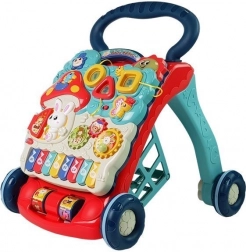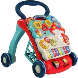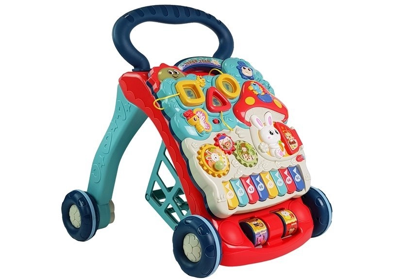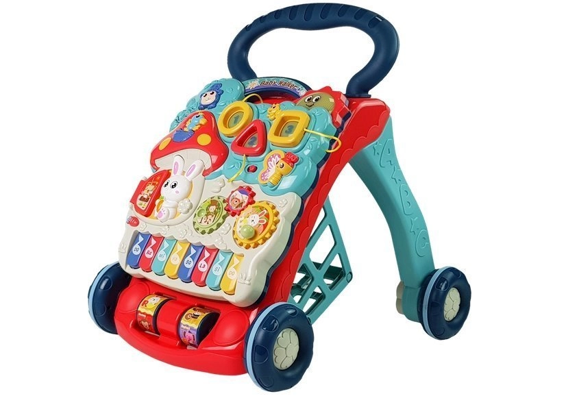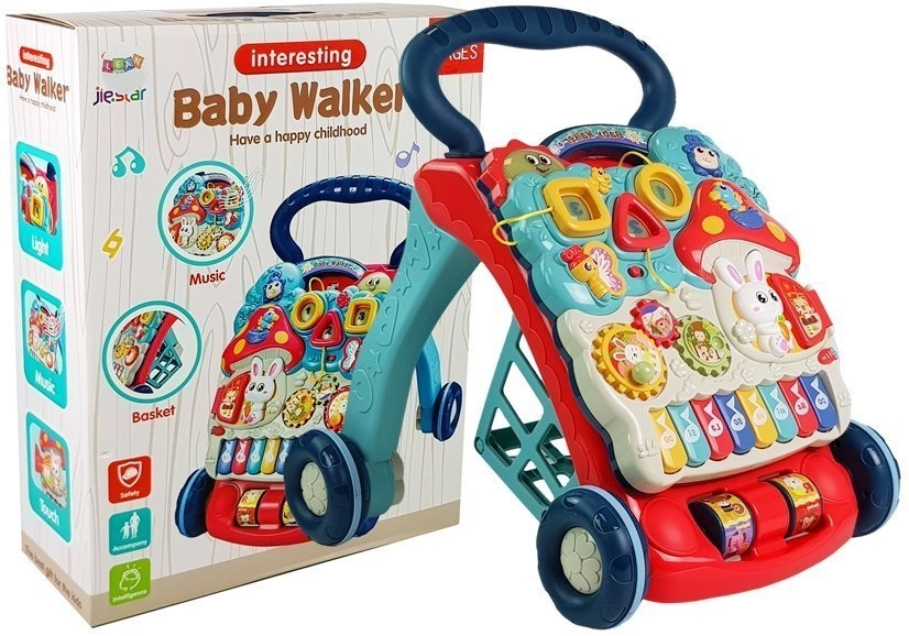 Na zadnji strani je košarica za shranjevanje potrebnih stvari, spodaj pa so barvni gumbi s slikami živali in črkami. Ta hojnik je odličen tako za majhne otroke, ki sedijo, kot tudi za večje, ki vstajajo in hodijo z vozičkom.