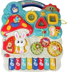 Izobraževalna plošča vsebuje različne aktivnosti, kot so barvni klavir, vstavljanka oblik in zvočni elementi, ki otroke na igriv način učijo oblike in zvoke.