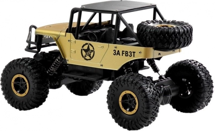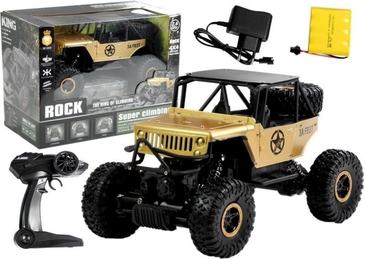 Zlati RC avto Jeep 1:18 s pogonom 4x4, amortizacijo in funkcijo Twist. Polnilne baterije, upravljalnik 2,4 GHz. Odlična zabava za otroke od 3 let.
