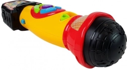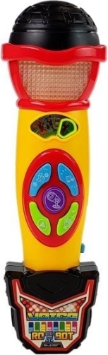 S pritiskom na zelen gumb otrok zlahka posname do 20 sekund in si posnetek takoj predvaja. Moder gumb z notami zažene melodije, osrednji gumb »mikrofon« doda glasbeno spremljavo in aplavz za pristno odrsko vzdušje. Igrača naravno razvija domišljijo, koncentracijo in koordinacijo.