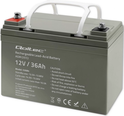 Zanesljiv AGM akumulator 12 V 36 Ah z največjim tokom 540 A za UPS, alarme, zasilno razsvetljavo in mobilne aplikacije. Ponuja dolgo življenjsko dobo do 10 let, brezvzdrževalno delovanje, tesno in varno zasnovo ter odpornost proti vibracijam z možnostjo montaže v poljubnem položaju.