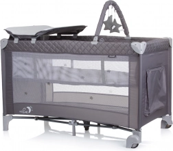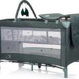 Vsebina paketa: zložljiva posteljica, druga raven z mehko podlogo, previjalna podloga, predal/organizator, viseči lok s 3 plišastimi igračami, transportna torba.