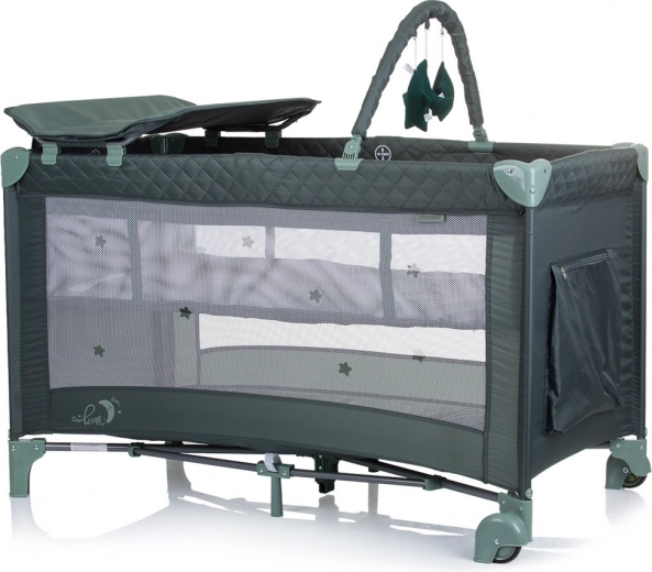 Praktična potovalna posteljica CHIPOLINO Luna ponuja 2v1 uporabo kot posteljica in igralni ogradek, 2 položaja vzmetnice, stabilno konstrukcijo ter bogato opremo, vključno s previjalno mizo, organizatorjem in visečim lokom z igračami. Zahvaljujoč kolesom z zavorami jo je enostavno premikati, hitro pa se zloži v prenosno torbo.