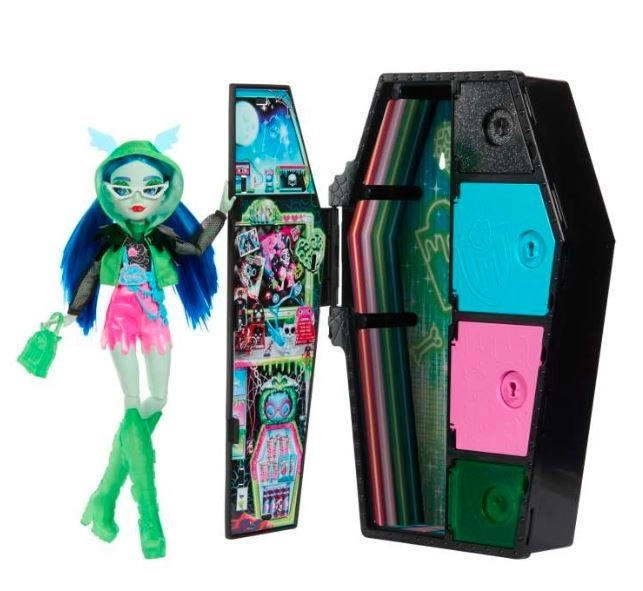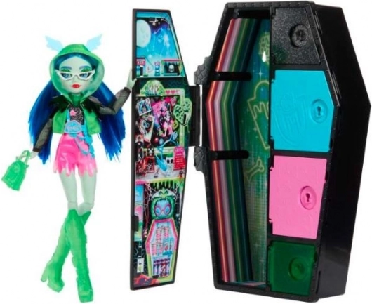 Monster High Skulltimate Secrets Neon Frights Ghoullia: punčka z 19+ presenečenji, 3 svetlečimi dodatki, Color Reveal in omarico v obliki krste.