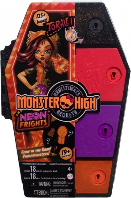 Odkrijte neonsko serijo Monster High Skullimate Secrets z lutko Toralei! Čakajo vas fluorescentne podrobnosti, presenečenja, skrita v predalčkih, dodatki, ki svetijo v temi in zabavno razkrivanje s pomočjo Color Reveal. Stajliš omarica v obliki krste služi za shranjevanje dodatkov in nadaljnjo igro.