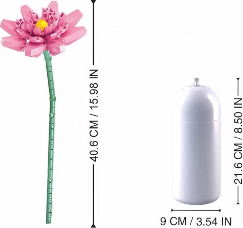 Set je v celoti kompatibilen z drugimi znamkami, zato ga zlahka razširite z lastnimi idejami. V paketu najdete podroben navodila za sestavljanje, ki vas vodijo skozi vsak korak. Sestavljen lotus doseže višino približno 40,6 cm, vaza meri 21,6 cm v višino in 9 × 9 cm v premer.