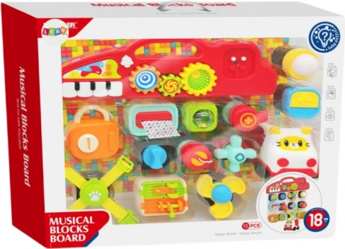 - Varnostni materiali: Vsi elementi so iz visokokakovostnih varnih materialov, ki zagotavljajo zaščito otrok med igro. Spodbuja razvoj ročnih spretnosti, koordinacijo oko–roka ter čutil, kot so vid, dotik in sluh.