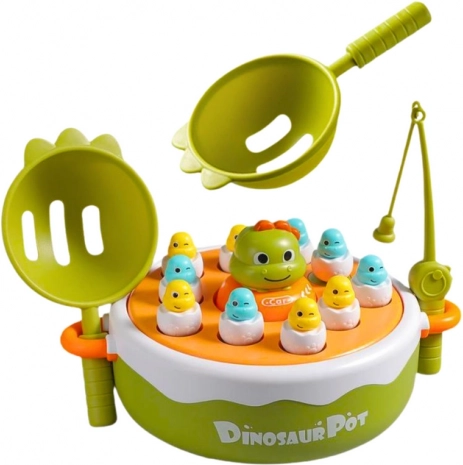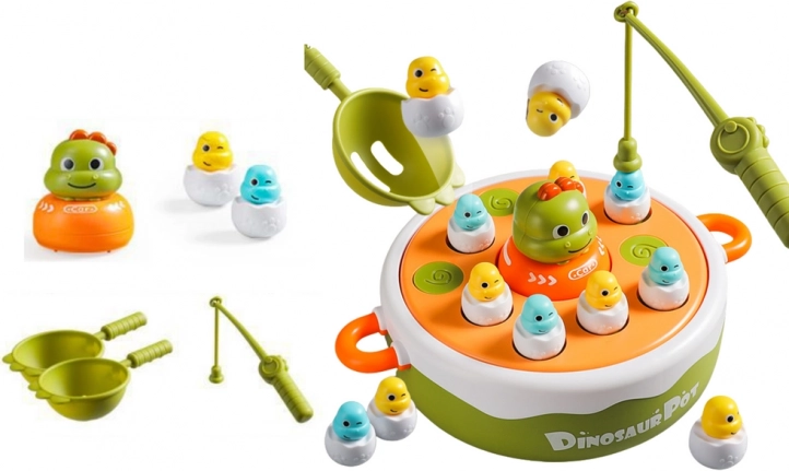 Ta lesena magnetna igra je odlična izbira za prve družabne igre. Otroci z magnetnimi palicami lovijo barvite dinozavrske dele, urijo natančnost gibov in zbranost ter se ob tem odlično zabavajo.