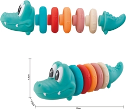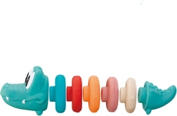 Ta simpatična piramida z glavo krokodila prinaša otrokom zabavo in učenje v enem. Barvni obročki različnih velikosti z reliefnimi številkami motivirajo k sortiranju, natikanju in štetju, s čimer naravno razvijajo spretnost in logično mišljenje. Mehka izvedba je prijetna na dotik in nežna do otroških rok.