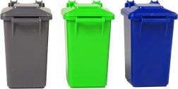 Del seta so tri barvne plastične kante, ki pomagajo pri učenju ločevanja različnih vrst odpadkov.