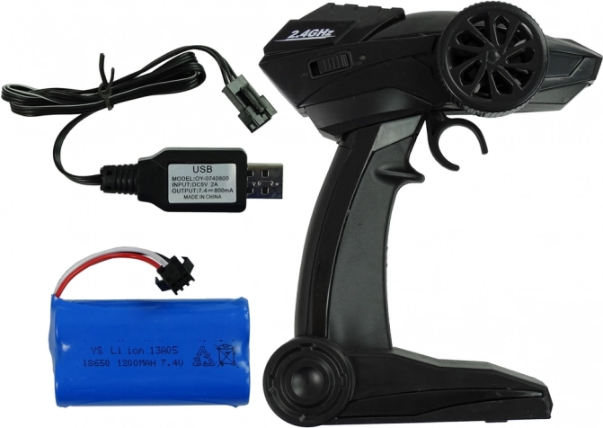 - Upravljanje 2,4 GHz z ergonomskim volanskim oddajnikom, doseg do 30 m, vožnja cca 12 min.
