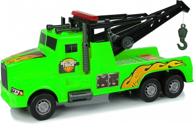 To robustno plastično vlečno vozilo bo zvezda vsake otroške garaže. Realistični detajli, zelena barva s plamenskimi nalepkami ter funkcionalna dvigalka z vitlom spodbujajo domišljijo in samostojno igro. Zahvaljujoč izvlečni vrvi na ročico in močnemu kavlju zlahka »odpelje« druge igrače na varno mesto.