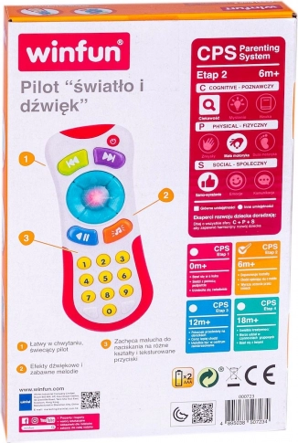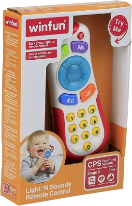 Interaktivni otroški daljinski upravljalnik je zasnovan tako, da je preprost za uporabo tudi za najmlajše. Vsebuje barvne gumbe, ki oddajajo različne zvoke in zabavne melodije. Rdeči svetlobni gumb doda še dodatni zabavni učinek. Skupno deset gumbov pomaga pri učenju prvih številk.