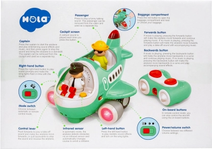Interaktivno RC letalo HOLA je zasnovano za varno in veselo igro. Zaradi zaobljenih robov ter trpežnega, zdravju neškodljivega materiala brez BPA je idealno za male raziskovalce. Upravljanje je preprosto, da si otroci hitro osvojijo osnove vodenja in razvijajo natančnost ter potrpežljivost.