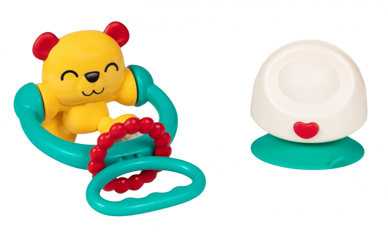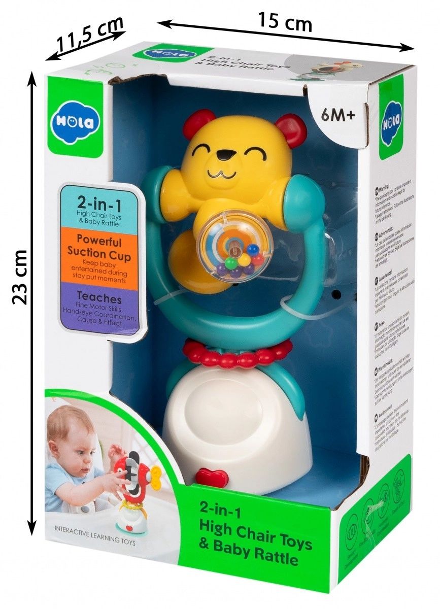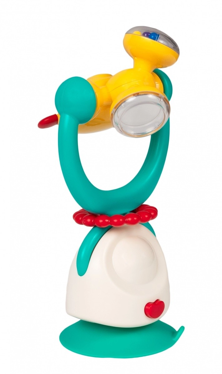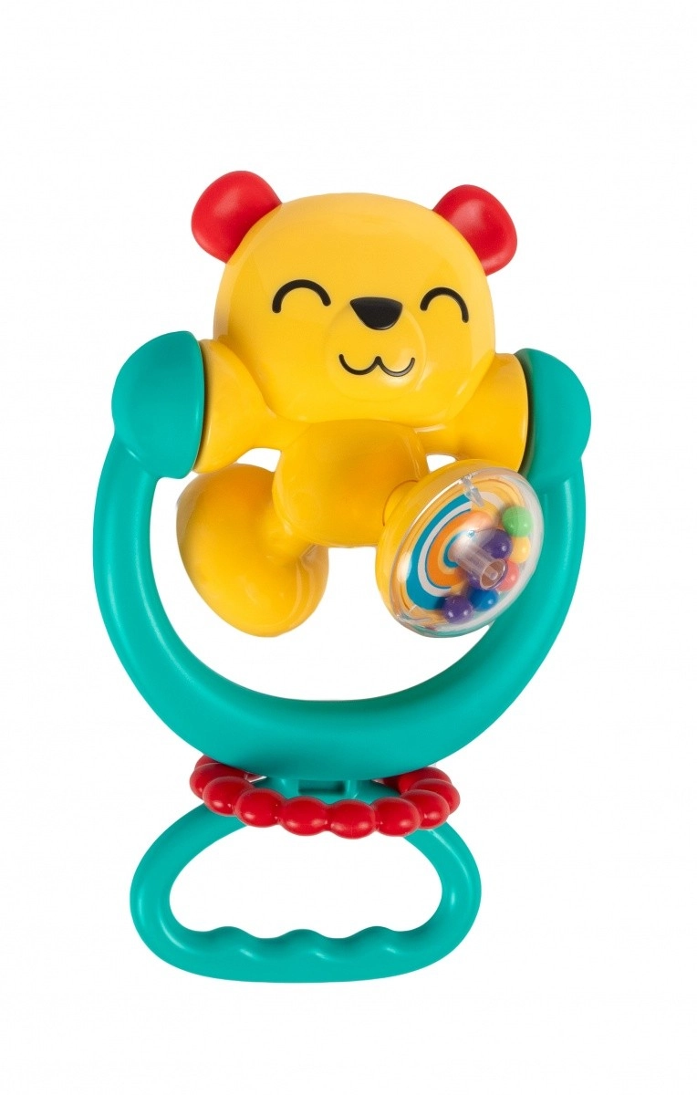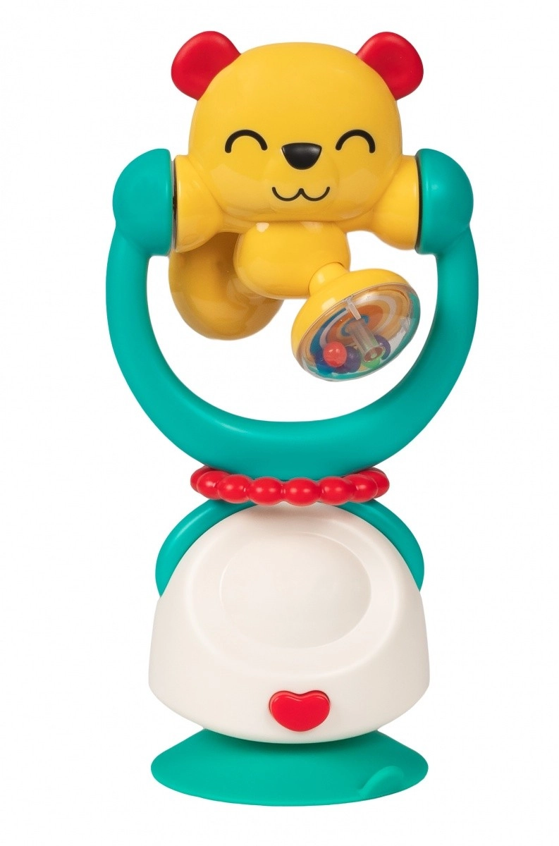 Ljubek medvedek pritegne pozornost z živimi barvami in prijetnimi zvoki. Zahvaljujoč vgrajeni ropotuljici otrok odkriva povezavo med gibom in zvokom, medtem ko vrtljiv vrh spodbuja radovednost ter koordinacijo rok in oči. Močan prisesek drži igračo stabilno na gladki površini – idealno za jedilni stolček ali mizo.