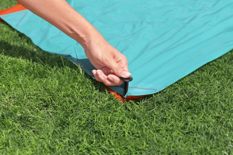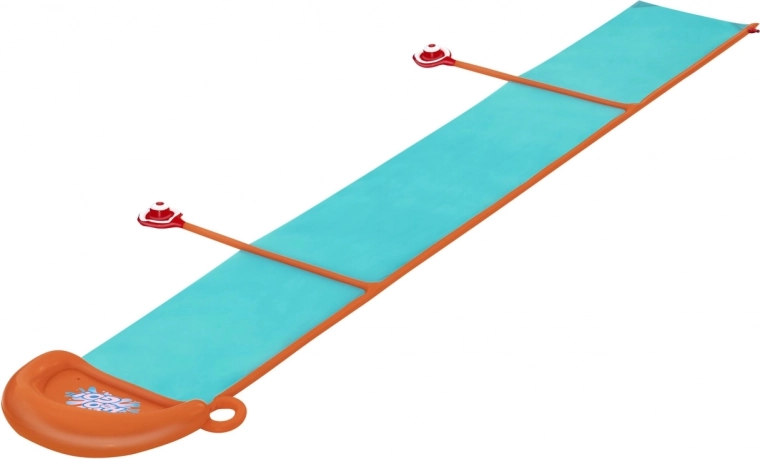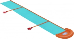Tobogan je enostavno namestiti – le priključite adapter na vrtno cev in ste pripravljeni na akcijo. Uživajte v samostojnem spuščanju ali si izmenjujte mesta s prijatelji. Na robovih tobogana so nameščene blazinice za nadzor pršenja vode, ki omogočajo interakcijo med tobogani.