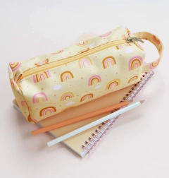 Rumeno etui za barvice z mavričnim potiskom je idealno za prenašanje šolskih potrebščin. Ima zadrgo in udoben ročaj.