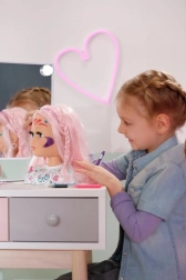 Ta kreativna glava za česanje je idealna za male stilistke in vizažistke. Dolgi rožnati lasje iz visokokakovostnega najlona odlično držijo obliko in so popolni za česanje, kitke in pletenje. S priloženimi flomastri in šablono lahko preprosto ustvarjate izviren make-up in zabavne motive na obrazu.