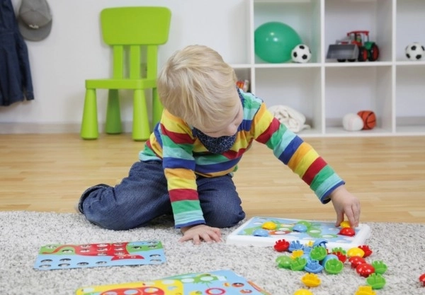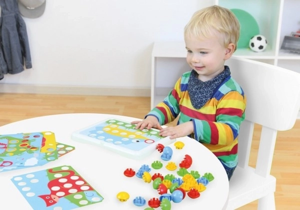 Ta mozaikna igra z velikimi, gladkimi klobučki je odličen način, kako otroke na zabaven način spodbujati pri razvoju spretnosti. Zahvaljujoč preglednim predlogam in preluknjani plošči se otroci učijo koordinacije oko–roka, vadijo potrpežljivost in razvijajo domišljijo. Veliki delci so dobro oprijemljivi in se varno vstavljajo.