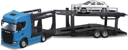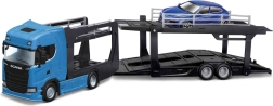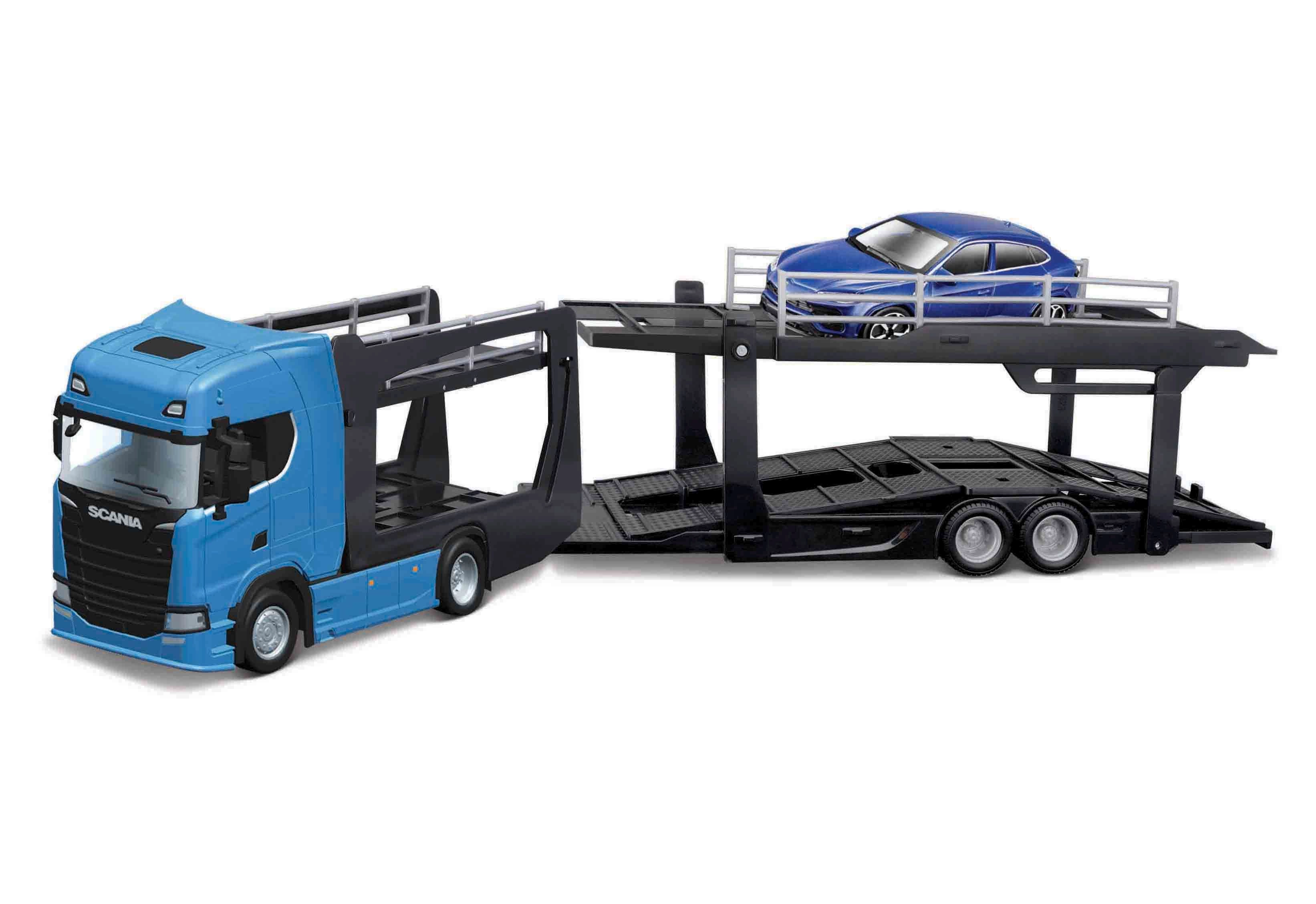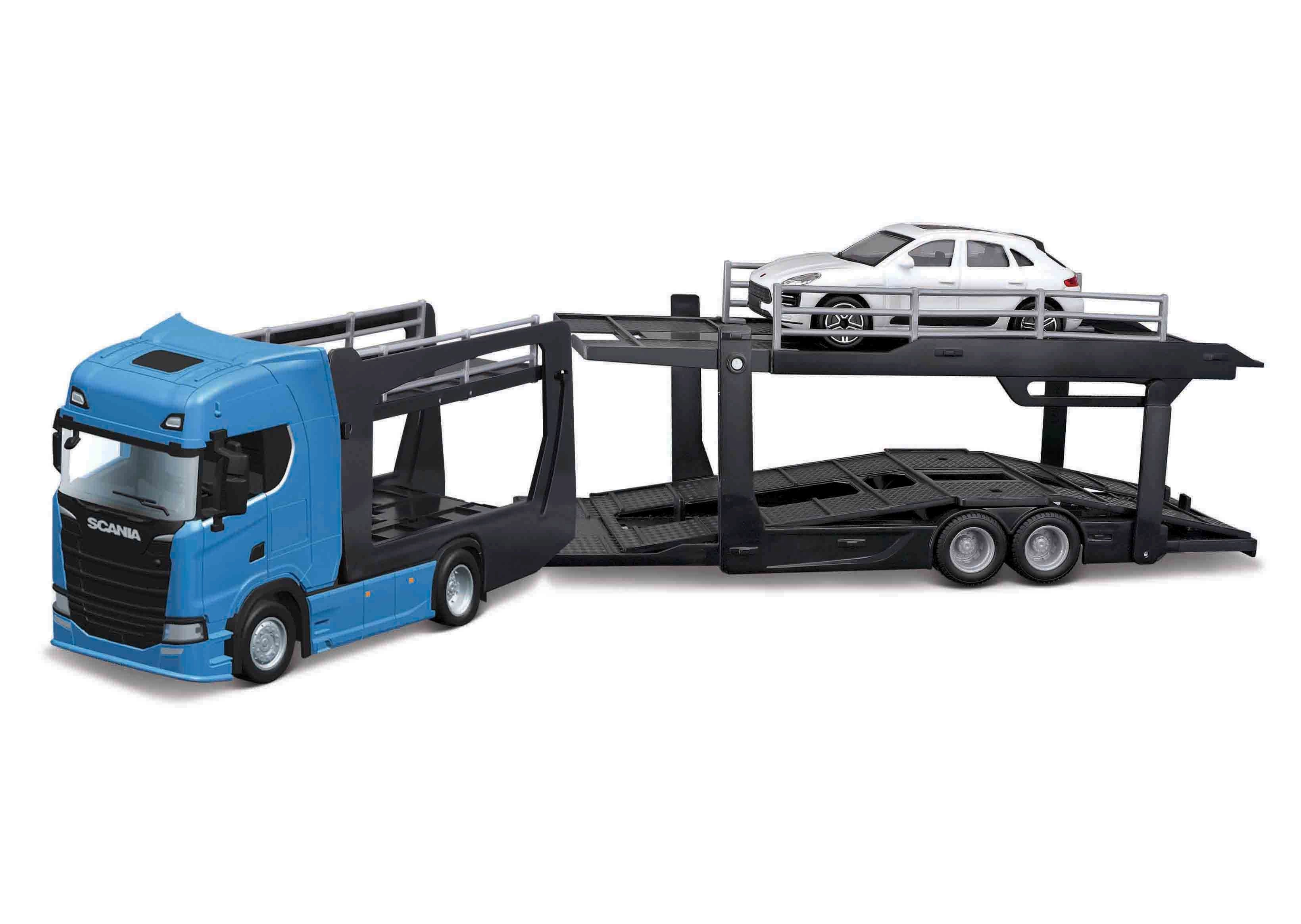 Večnadstropna prikolica s stransko ograjo in najedznimi rampami omogoča enostavno nakladanje in prevoz malih avtomobilčkov – povsem kot v resničnosti.