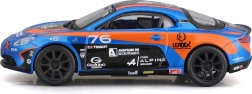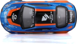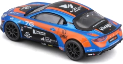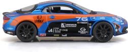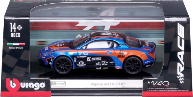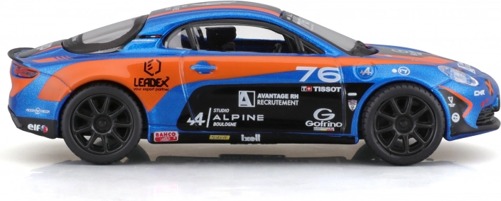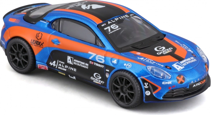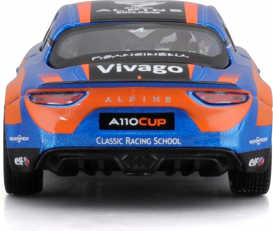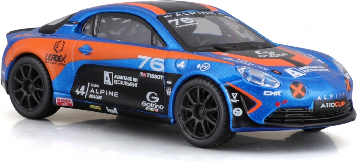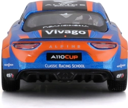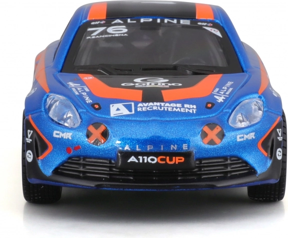 Podroben model dirkalnega vozila Alpine A110 Cup v ikonični modro-oranžni dirkalni livery prinaša realistične proporce, čiste potiske sponzorjev in prosto vrtljiva kolesa za tekoče premikanje. Tonirana okna, oblikovani žarometi in aerodinamična silhueta poudarjajo športni značaj izvirnika.